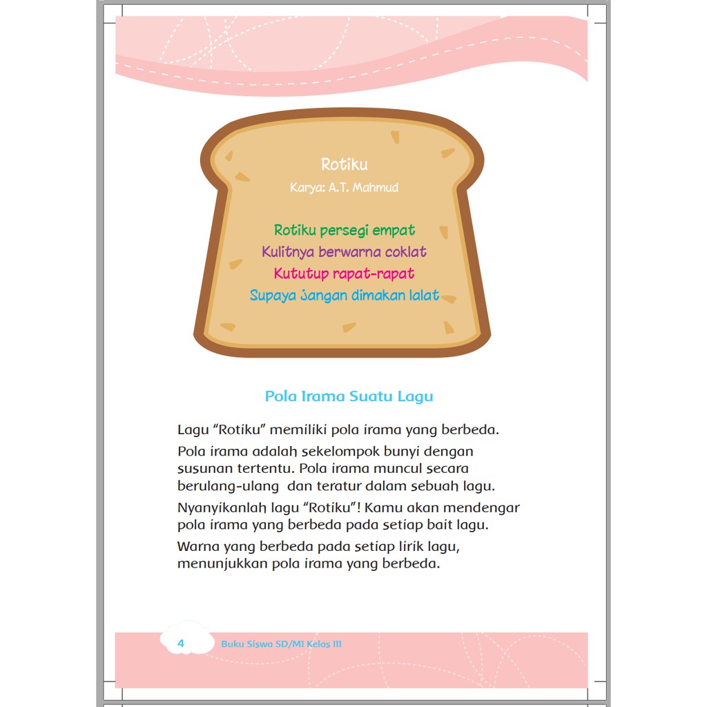 Berikut ini lirik lagu rotiku ciptaan at mahmud. Amati pola irama dan liriknya! Lagu rotiku memiliki pola irama yang berbeda. Dengan menyimak penjelasan guru tentang pola irama, siswa dapat memahami perbedaan pola irama yang terdapat pada sebuah lagu dengan tepat. Lagu rotiku memiliki pola irama yg berbeda pada setiap bait lagu. Hal inilah yang nantinya akan membentuk irama musik. Dengan mendengarkan lagu rotiku, siswa dapat mengenal pola irama sebuah lagu dengan tepat dan percaya diri. Berikut ini lirik lagu rotiku ciptaan at mahmud. Pola irama adalah sekelompok bunyi dengan susunan tertentu. Lagu 'rotiku' mengambil tema dari salah satu jenis. Kunci jawaban tema 7 kelas 3 sd/mi soal halaman Lagu 'rotiku' sendiri memiliki pola irama 2/4 yang berarti pola irama sedang. Pada setiap bait, lagu rotiku memiliki pola irama yang.