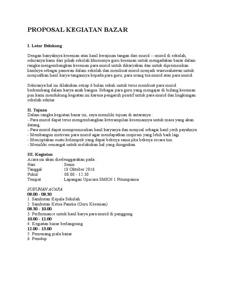 Pendahuluan kegiatan aktifitas kbm yang dilaksanakan di sekolah tak hanya sebatas di dalam kelas. Rencana tersebut harus dituliskan agar pihak yang berkepentingan dapat memahami dengan baik. Untuk bisa lebih memahami lagi berikut contoh proposal kegiatan sekolah yang mungkin bisa jadi referensi. Contoh proposal kegiatan bazar di sekolah. Proposal kegiatan bazar osis sma negeri 3 sengkang unggulan kabupaten wajo masa bakti 2010 proposal kegiatan bazaar.
